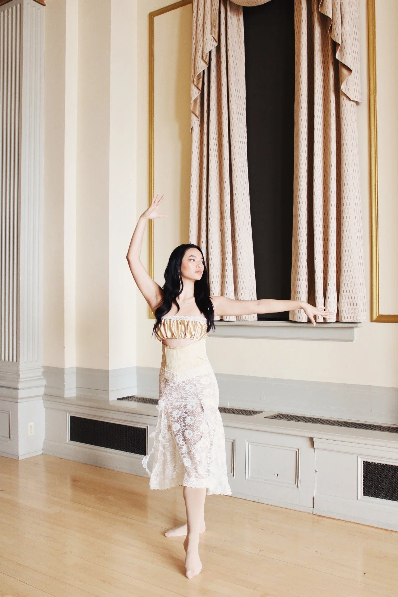 A waltz between light and memory, this look is crafted from thrifted brocade and a delicate lace, catching the warmth of an imagined golden hour. A piece that moves not just with the body, but with the ephemeral glow of time suspended.
